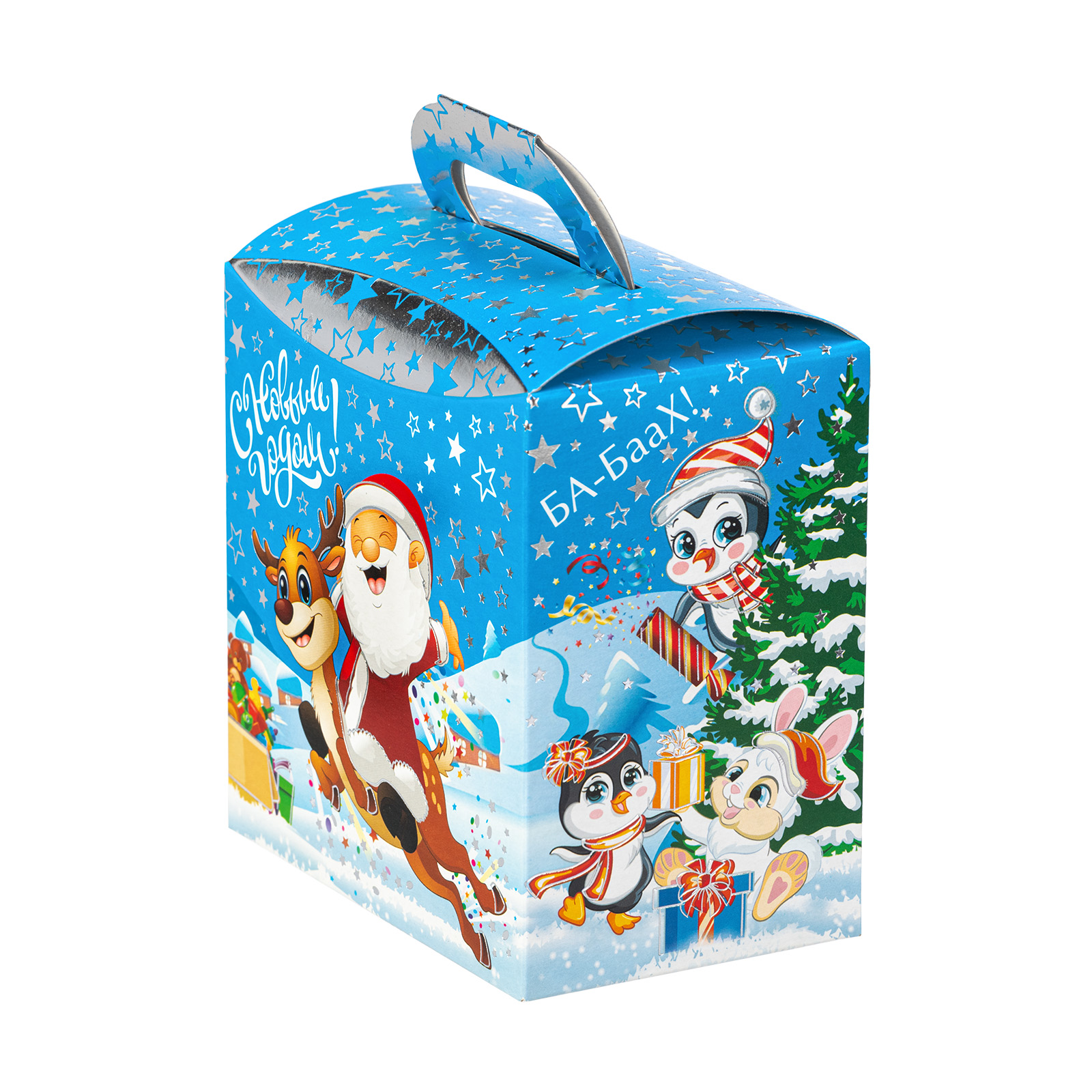 Формула идеального новогоднего сладкого подарка предельно проста: привлекательная яркая упаковка + вкусные сладости внутри. Именно такими характеристиками и обладает данный подарочный набор. Это небольшая картонная коробка с забавной новогодней иллюстрацией, на которой Дедушка Мороз и его верный товарищ олень весело мчатся по заснеженной долине мимо ее обитателей. На упаковке есть поздравительная надпись, сверху находится удобная ручка, но самое главное спрятано внутри этой маленькой коробочки! Там находится 400 грамм отборных сладостей от ведущих кондитерских компаний и небольшой памятный сувенир!