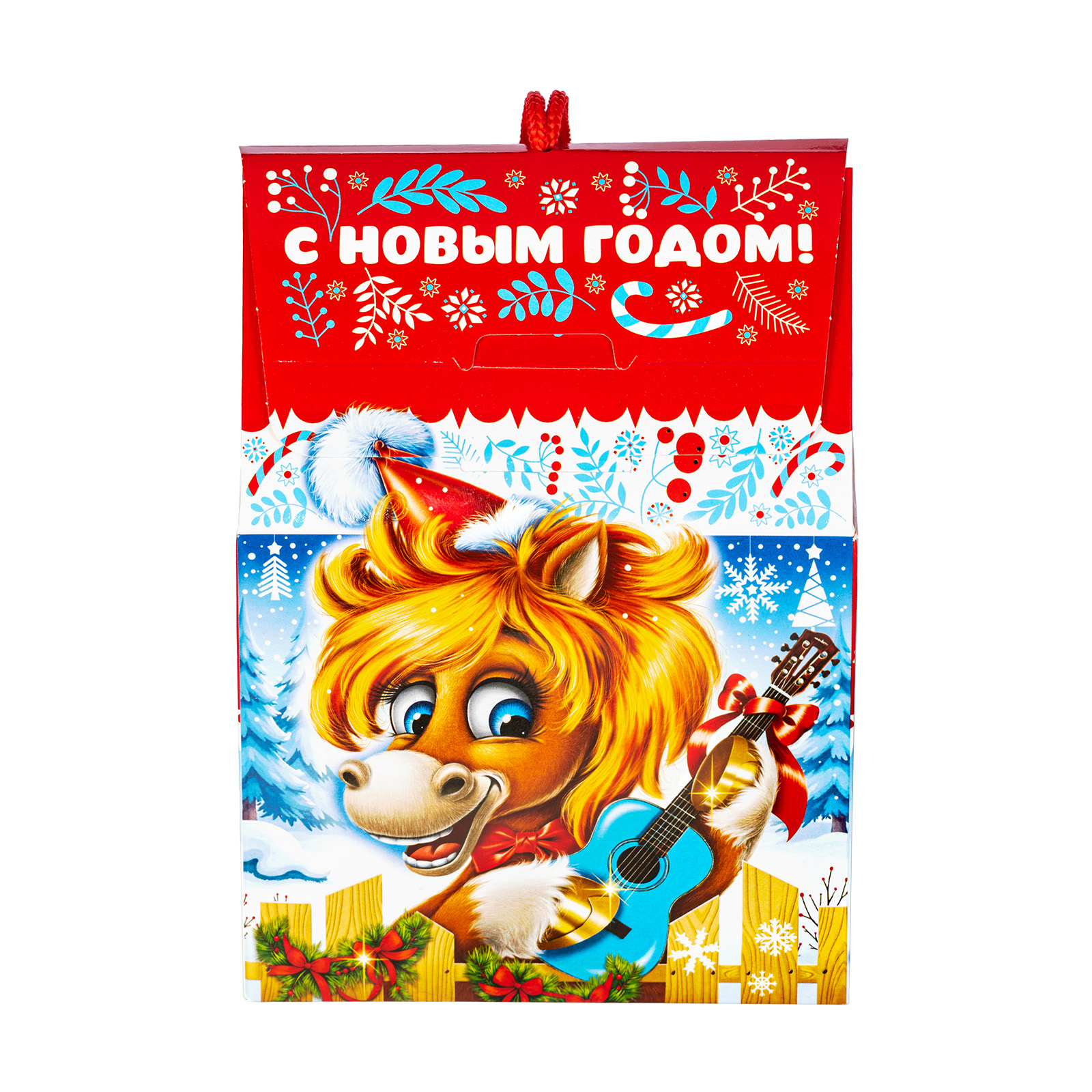 Этот компактный подарочный набор с удобной ручкой-шнурком идеально подходит для праздника в детском учреждении. Упаковка выполнена в сочетании ярко-красного цвета с различными холодными тонами, что придает ей привлекательности. На передной части мы видим забавную иллюстрацию с главным героем - веселым рыжим жеребцом Кешей, который держит в руках небольшую голубую гитару и, видимо, репетирует песню для новогоднего праздника. Внутри подарок также прекрасен: в его состав входит 600 грамм разнообразных лакомств и небольшой памятный сувенир, который еще долго будет напоминать всей вашей семье об этих замечательных праздниках.