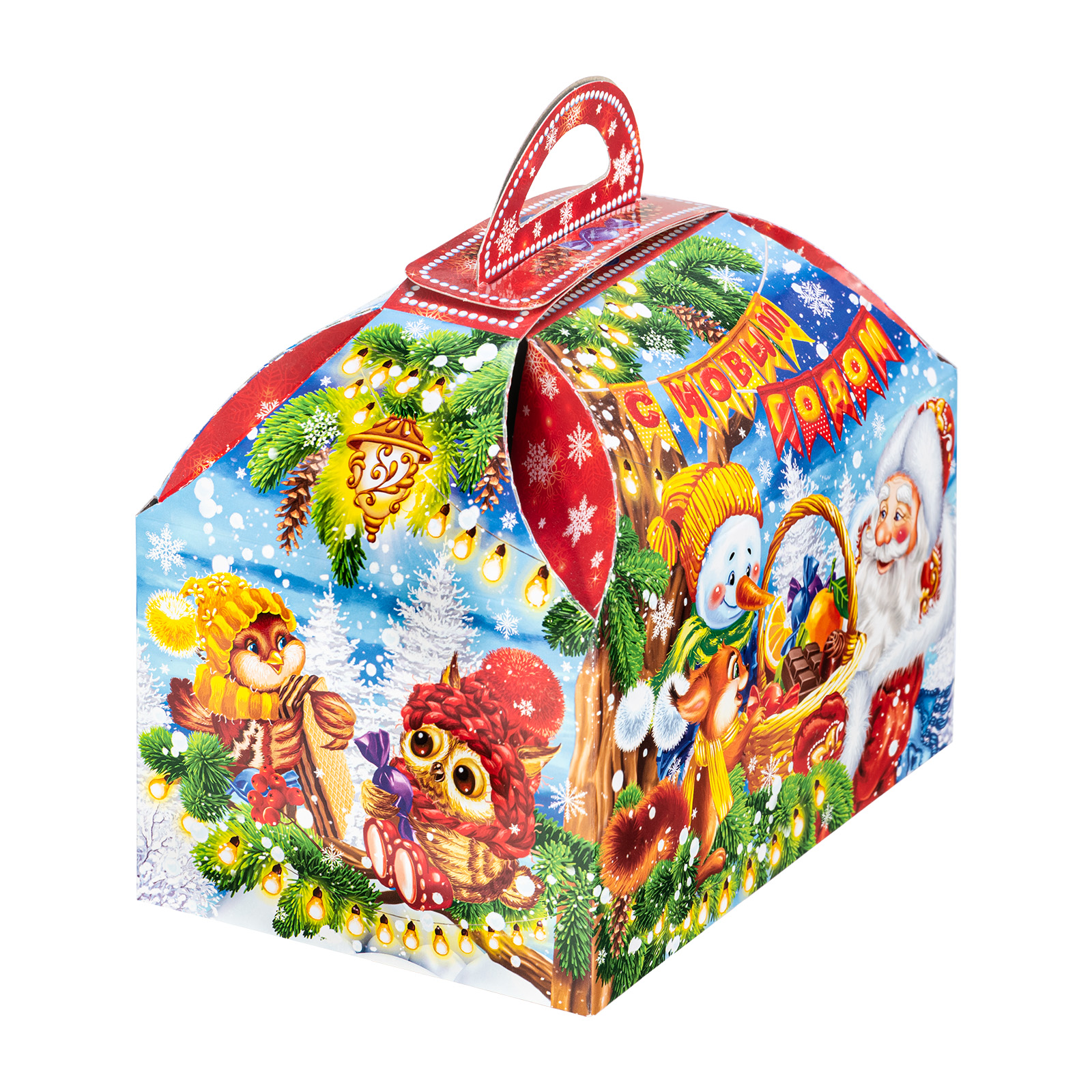 Подарите своим родным и близким безграничную радость вместе с новогодним сладким подарком “Сундук лакомств”. Этот подарочный набор представляет собой небольшую картонную коробочку в форме сундука с удобной ручкой сверху. На упаковке нанесен очень яркий привлекательный рисунок, на котором Дед Мороз и его друзья обмениваются подарками и веселыми улыбками. В состав подарка входит 900 грамм вкусных и разнообразных лакомств от ведущих кондитерских предприятий,  а также небольшой памятный сувенир в виде символа наступающего года.